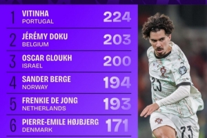 世歐預(yù)進(jìn)攻三區(qū)成功傳球榜:維蒂尼亞壓多庫居首,德容、魔笛在列