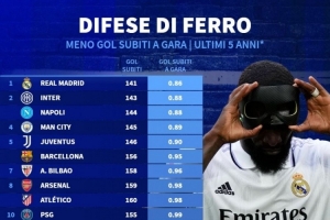 近5年五大聯(lián)賽場(chǎng)均失球最少榜:皇馬居首,國(guó)米、那不勒斯前三