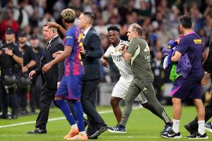 亞馬爾走近場邊時,維尼修斯走過來對他做了“話太多”的手勢,兩人發(fā)生爭吵?;蜀R門將教練略比斯試圖將維尼修斯拖回球員通道,但這位巴西人開始沖向亞馬爾,被皇馬四名工作人員攔住。拉菲尼亞跑向國家隊隊友維尼修斯,被皇馬的巴爾韋德及時制止。