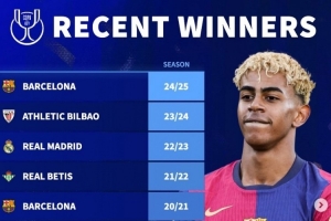 體育資訊10月29日訊 《轉(zhuǎn)會(huì)市場(chǎng)》統(tǒng)計(jì)了近10年國(guó)王杯奪冠情況,巴薩5次奪冠居首。
