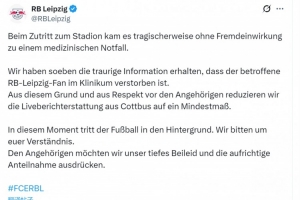 萊比錫俱樂(lè)部確認(rèn),一名萊比錫球迷進(jìn)入球場(chǎng)時(shí)發(fā)生緊急醫(yī)療情況(與外部因素?zé)o關(guān)),被送往醫(yī)院,最終在醫(yī)院去世,萊比錫俱樂(lè)部社媒因此將這場(chǎng)比賽的直播報(bào)道減少到最低限度,并向家屬表示深切慰問(wèn)。