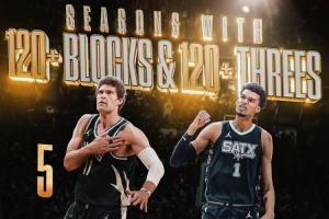 單賽季同時達成120+三分和蓋帽:大洛5次,文班2次,此外沒人能多次做到。