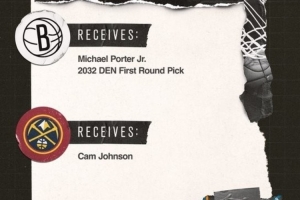 這筆交易中,籃網(wǎng)送出卡梅隆-約翰遜,得到小邁克爾-波特和2032年掘金的首輪選秀權(quán)。