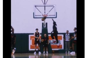 視頻中的楊瀚森與翻譯在籃下看隊(duì)友扣籃熱身。