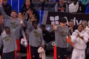 首節(jié)比賽,開拓者中鋒羅伯特·威廉姆斯飚中生涯第二記三分,楊瀚森與替補(bǔ)席的隊(duì)友們開心慶祝。