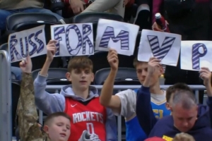 末節(jié)7中6爆砍15分!身穿火箭威少球衣的球迷舉牌子:威少是MVP