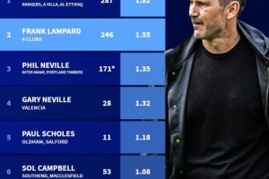 德國轉(zhuǎn)會市場盤點了英格蘭“黃金一代”球員在教練崗位上的執(zhí)教戰(zhàn)績,杰拉德以場均1.82分居首,蘭帕德以場均1.55分位居次席。