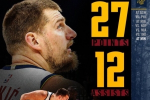 此役,官方數(shù)據(jù)凍結(jié)。掘金官方曬出了約基奇本場(chǎng)比賽數(shù)據(jù),27分10籃板12助攻,這是他本賽季第7次三雙。