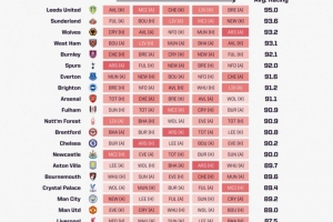 OPTA為各隊(duì)未來(lái)5輪聯(lián)賽的困難程度進(jìn)行了量化打分,利茲聯(lián)賽程95.0分最困難,桑德蘭(93.6分)、狼隊(duì)(93.2分)、西漢姆(93.1分)、伯恩利(92.1分)分列二到五位。