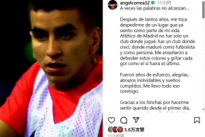 安赫爾-科雷亞寫(xiě)道:“有些心情難以言表,在歷經(jīng)這么多年后,我不得不向這個(gè)已成為生命一部分的地方道別。馬競(jìng)不僅是我效力的俱樂(lè)部,更是我作為球員和男人成長(zhǎng)的搖籃。在這里,我學(xué)會(huì)了為紅白榮耀而戰(zhàn),懂得了每個(gè)進(jìn)球都該像最后一球那樣盡情吶喊。”