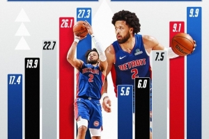 體育資訊11月21日訊 NBA官方曬出了康寧漢姆五個(gè)賽季以來(lái)的得分、助攻數(shù)據(jù)的提升表現(xiàn)。