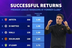 體育資訊11月21日訊 德國(guó)轉(zhuǎn)會(huì)市場(chǎng)統(tǒng)計(jì)了教練執(zhí)教球員時(shí)代英超老東家的場(chǎng)均積分,并列出榜單,阿爾特塔1.99分居首,迪馬特奧1.98分次席。