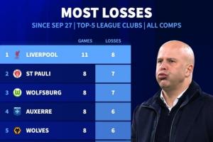 輸了8場!利物浦是自9月27日以來五大聯(lián)賽輸球場數(shù)最多的球隊