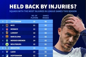 本賽季五大聯(lián)賽累計傷缺場次榜:熱刺92場最多,巴薩62場第五