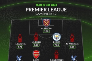 WhoScored英超第12輪最佳陣容:埃澤、魯本·迪亞斯在列,森林4人