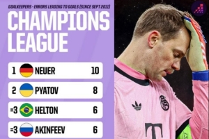 體育資訊11月27日訊 在本輪歐冠,阿森納3-1擊敗拜仁,諾伊爾出擊失誤導(dǎo)致丟球。數(shù)據(jù)網(wǎng)站OPTA也盤(pán)點(diǎn)了自2011年9月以來(lái)歐冠賽場(chǎng)門將因失誤導(dǎo)致丟球榜單,具體如下: