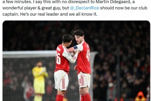 阿森納擁躉摩根在社媒曬出賴斯本場戴上隊長袖標的照片,寫道:“賴斯昨晚比賽中首次戴上阿森納隊長袖標,盡管只有幾分鐘。我這么說并不是出于對厄德高的不敬,他也是一名出色的球員、很棒的伙計,但是賴斯現(xiàn)在應該成為球隊隊長了,他是我們真正的領袖,這我們都知道的。”