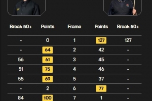 諾鵬·桑卡姆打出單桿127分,龐俊旭打出56、51、55、84分共四桿50+,最終龐俊旭以6-2的比分戰(zhàn)勝諾鵬·???,晉級(jí)英錦賽正賽。