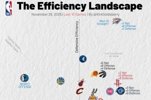 橫軸代表進攻效率,越靠右越好,縱軸代表防守效率,越靠上越強。第一象限的球隊多為發(fā)揮出色的球隊,而在第三象限的球隊通常為戰(zhàn)績比較糟糕的球隊。