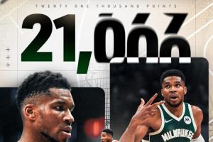 字母哥(30歲零358天)是NBA歷史拿到21000分第六年輕的球員,前五是詹姆斯(28歲零97天)、張伯倫(29歲零184天)、科比(29歲零194天)、杜蘭特(30歲零23天)和喬丹(30歲零34天)。
