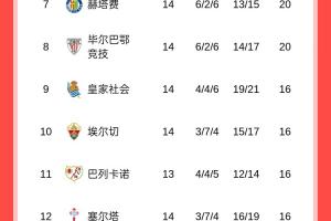體育資訊12月1日訊 西甲第14輪結束大部分比賽,最新積分榜如下: