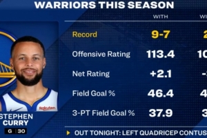 轉(zhuǎn)播方給出一組數(shù)據(jù),本賽季庫里在場時勇士9勝7負,進攻效率113.4,凈效率+2.1,投籃命中率46.4%,三分命中率37.9%;
