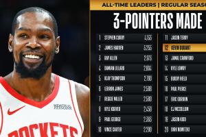 本場比賽,杜蘭特達(dá)成兩項(xiàng)里程碑,除了生涯突破31000分外,他的三分命中數(shù)(2223)也超過賈馬爾·克勞福德(2221),獨(dú)享歷史第12名。