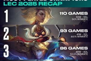 體育資訊12月6日訊 LEC2025賽季回顧:選用最多次數(shù)的英雄芮爾&被禁最多次數(shù)的英雄大樹???。