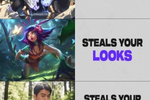 體育資訊7月12日訊 LOL官推分享圖片,圖片內(nèi)容大意如下:塞拉斯偷你的大招,妮蔻偷你的樣子,Gumayusi偷你的龍(中立資源)
