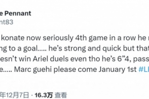 彭南特寫(xiě)道:“我真是受夠科納特了,這已經(jīng)是他連續(xù)第四場(chǎng)比賽犯錯(cuò)導(dǎo)致失球了……他雖然身體強(qiáng)壯速度快,但僅此而已,技術(shù)簡(jiǎn)直糟糕透頂,明明身高1米93卻連空中對(duì)抗都贏不了,傳球水平跟業(yè)余聯(lián)賽球員沒(méi)兩樣,格伊請(qǐng)務(wù)必在1月1日加盟利物浦?!?/p>