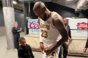 賽后,一位小球迷拿著詹姆斯的球衣,后者在球員通道送上簽名。