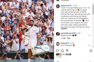 德約科維奇社媒寫道:“我要祝賀辛納的精彩表現(xiàn)??回到溫布爾登,與大家分享這份激動(dòng),與倫敦人共度時(shí)光,并有家人的陪伴,這一切都非常特別。”