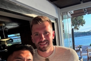體育資訊7月13日訊 菲律賓球員基弗-拉維納曬出了在希臘雅典和湖人球員東契奇和八村塁合影的照片。從照片中可以看出,這個(gè)休賽期東契奇的體型保持的不錯(cuò)。