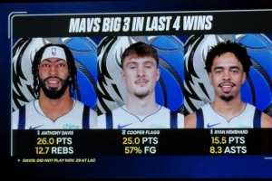 賽前,轉(zhuǎn)播方給出獨(dú)行俠過(guò)去4場(chǎng)勝利,濃眉、弗拉格、小納姆哈德三人組的數(shù)據(jù):