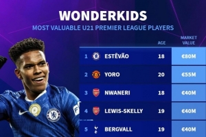 體育資訊12月13日訊 德國轉(zhuǎn)會市場列出了英超U21球員身價排名,埃斯特旺8000萬歐居首,約羅5500萬歐次席。