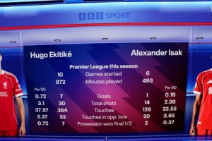 以下為利物浦兩大鋒線(xiàn)新援?;倏恕⒁了_克本賽季英超數(shù)據(jù)對(duì)比,具體如下(括號(hào)內(nèi)為每90分鐘數(shù)據(jù)):