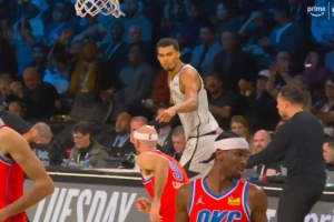 GIF-文班亞馬面對卡魯索干擾打進(jìn)中距離 然后回頭手指著對手振振有詞