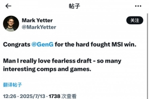 體育資訊7月13日訊 2025MSI,GEN3-2戰(zhàn)勝T1實現(xiàn)兩連冠,前英雄聯(lián)盟首席設(shè)計師、現(xiàn)拳頭MMO游戲總監(jiān)發(fā)文:恭喜GEN拿下這場來之不易的MSI勝利。說真的我超愛全局BP,這么多有趣的陣容和比賽。