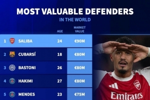 體育資訊12月15日訊 德國轉會市場列出了后衛(wèi)身價排名,薩利巴9000萬歐居首。