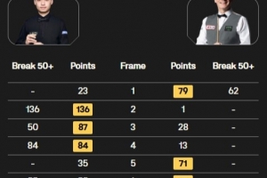 斯佳輝打出一桿破百(136)和三桿50+(88、74、55),馬克·戴維斯打出單桿62分,雙方戰(zhàn)至決勝局,斯佳輝以4-3的比分戰(zhàn)勝馬克·戴維斯晉級(jí)32強(qiáng)。