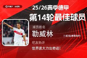 第14輪評選結(jié)果出爐,斯圖加特球員勒威林獨造三球,并轟出無解世界波,助球隊大勝不萊梅,獲得吧友超1萬票支持,當(dāng)選【體育資訊X小紅書德甲第14輪最佳球員】!