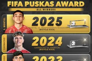 體育資訊12月16日訊 2025年普斯卡什獎公布,25歲的阿根廷球員圣地亞哥·蒙鐵爾憑借一記禁區(qū)外的精彩倒勾獲獎。算上這粒進(jìn)球,普斯卡什已經(jīng)連續(xù)4年由倒勾進(jìn)球當(dāng)選。