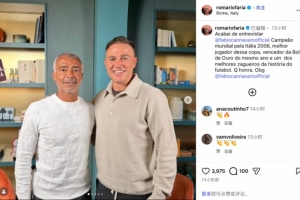 羅馬里奧在社媒寫道:“剛剛采訪了06年意大利隊(duì)世界杯冠軍成員、最佳球員、06年世界足球先生、前足壇最頂尖的后衛(wèi)法比奧·卡納瓦羅。深感榮幸。”