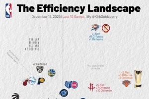 橫軸代表進攻效率,越靠右越好,縱軸代表防守效率,越靠上越強。第一象限的球隊多為發(fā)揮出色的球隊,而在第三象限的球隊通常為戰(zhàn)績比較糟糕的球隊。