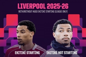 數(shù)據(jù)統(tǒng)計(jì)顯示,埃基蒂克本賽季英超首發(fā)情況下,利物浦10場(chǎng)7勝1平2負(fù),場(chǎng)均打進(jìn)2球、獲得2.2分。