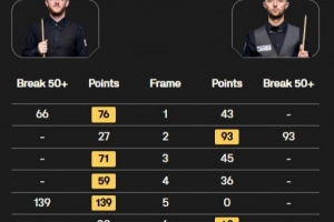 馬克·艾倫打出一桿破百(39)和一桿50+(66),喬·奧康納打出一桿50+(93),上半場結(jié)束艾倫3-1領(lǐng)先奧康納,最終馬克·艾倫5-2戰(zhàn)勝喬·奧康納晉級半決賽。