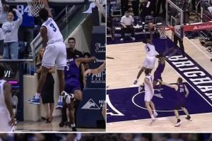 NCAA常規(guī)賽,楊百翰大學(xué)對(duì)陣艾柏林基督大學(xué),迪班薩上演炸裂單手隔人補(bǔ)扣。