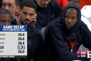 杜蘭特今天目前得到31分,最后時(shí)刻又回到場(chǎng)上,場(chǎng)均得分可能還會(huì)上漲。