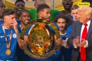 賽后頒獎(jiǎng)儀式上,切爾西準(zhǔn)備捧杯之際,特朗普一直站在中間。切爾西球員桑切斯對(duì)其說(shuō)了幾句話,因凡蒂諾也向其示意。