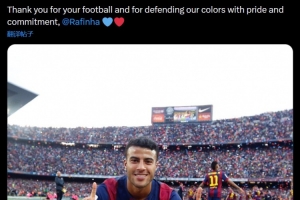 巴薩官方寫道:“感謝你帶來的足球,以及感謝你以驕傲和責(zé)任心捍衛(wèi)我們的顏色,拉菲尼亞????”